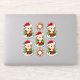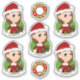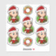 Ensemble de sept autocollants en vinyle coupé avec l'illustration d'une jolie petite fille souriante et joyeuse aux cheveux longs et marron, vêtue de vêtements de Noël et portant un casquette de Père Noël rouge, sur un arrière - plan vert ; cinq autocollants de la fille et deux autocollants avec une couronne de Noël ; avec un modèle de texte personnalisable pour votre nom ou message