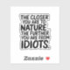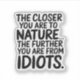 Échappez à l'agitation et embrassez la tranquillité de la nature avec cet autocollant spirituel ! Avec la phrase « Plus on est près de la nature... plus on est loin des idiots », cet autocollant est parfait pour les amateurs de plein air, les introvertis ou quiconque préfère la compagnie des arbres à celle des gens. Collez-le sur votre ordinateur portable, votre bouteille d'eau, votre équipement de randonnée ou n'importe où ailleurs pour exprimer votre amour pour le monde naturel et une touche d'humour sarcastique. Cet autocollant en vinyle résistant est conçu pour résister aux éléments, tout comme votre esprit d'aventure.