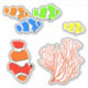 Autocollants de poisson clown avec corail de mer. Des autocollants amusants pour les enfants dans des couleurs vives et primaires. Donnez comme faveurs aux fêtes d'anniversaire thématiques "sous la mer", ou ajoutez aux enveloppes, paquets ou pages de livres à griller.