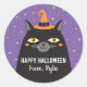 Un mignon chat d'Halloween noir avec un casquette décore cet autocollant. Personnalisez-le pour des gâteries en classe Halloween, ou pour une fête d'Halloween. Conçu pour vous par Blackberry Boulevard.