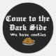 Cet autocollant comique dit 'Come to the Dark Side - We have cookies' en deux polices fantaisistes. Juste en dessous du texte se trouve une plaque de cookies pour illustrer les cookies proposés pour rejoindre le côté sombre.