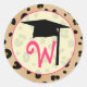Un autocollant de graduation avec un arrière - plan empreinte de léopard. Personnalisez avec votre monogramme sous capuchon de graduation noir à l'intérieur du cercle rose.