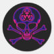 Autocollant noir avec un symbole de risque biologique vif crâne et arêtes croisées en bleu et rouge.