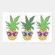 Parfait pour l'été, cet autocollant présente des illustrations graphiques colorées d'ananas portant des lunettes de soleil rétros, reflétées dans leurs verres violets.