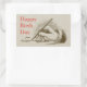 Autocollant d'anniversaire inspiré d'une photo vintage d'une main d'homme tenant un stylo plume. La main vient de finir d'écrire un simple vœu d'anniversaire, juste Joyeux Anniversaire et le nom de l'expéditeur.