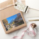 Autocollant rectangulaire de photo avec un paysage rural avec une route, une grange et des arbres dans des couleurs de chute et une vue montagnes vers de Geisler ou d'Odle dolomites en automne dans la vallée de Funes de Di de Val au Tyrol du sud, Italie.