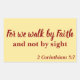 Un grand autocollant design avec un message chrétien, cet article dit "Car nous marchons par la foi et pas la vue" 2 Corinthiens 5:7 écrit en police rouge sur un arrière - plan d'or. Commandez les vôtres dès aujourd'hui !