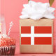 The national flag of Denmark, Dannebrog, is red with a white scandinavian cross that extends to the edges of the flag.