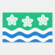 Sticker avec design avec drapeau du comté historique de Cumberland, en Angleterre, Grande-Bretagne; drapeau vert avec trois fleurs Parnassus et vagues blanches et bleues
