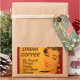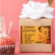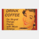 Femme souriante avec rouge à lèvres rétro et ongles boit sa tasse de café du matin. La légende dit : "Buvez du café - Faites des choses stupides plus vite avec plus d'énergie."