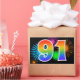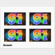 Cette conception d'autocollant amusante et vibrante présente un motif coloré inspiré de feux d'artifice de célébration, ainsi que le nombre "91" ayant un motif de dégradé inspiré d'un arc-en-ciel multicolore, sur un fond de couleur noire. Des autocollants comme celui-ci pourraient peut-être être utilisés lors d'une fête célébrant le quatre-vingt-onzième anniversaire de quelqu'un, ou peut-être pour le quatre-vingt-onzième anniversaire de mariage d'un couple, ou pour un autre événement 91ème. [~Z0000324]