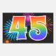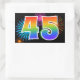 Cette conception d'autocollant amusante et vibrante présente un motif coloré inspiré de feux d'artifice de célébration, ainsi que le nombre "45" ayant un motif de dégradé inspiré d'un arc-en-ciel multicolore, sur un fond de couleur noire. Des autocollants comme celui-ci pourraient être utilisés lors d'une fête célébrant le quarante-cinquième anniversaire de quelqu'un, ou peut-être pour les quarante-cinq ans de mariage d'un couple, ou un autre événement marquant les 45 ans.
