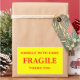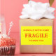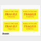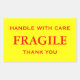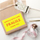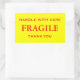 Stickers avec : Fragile. Manipuler avec soin. Merci. Texte rouge sur un arrière - plan jaune. Personnalisez avec vos informations en utilisant les modèles faciles. La couleur de police, le style de police, la taille de police et la couleur jaune arrière - plan sont personnalisables.