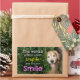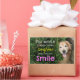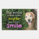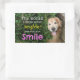 Ces autocollants sont munis d'une photo d'un chien de repérage doré souriant qui s'approche derrière un buisson vert. La citation dit : "Le monde est toujours plus brillant de derrière un sourire."