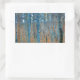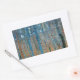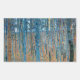 Il s'agit d'oeuvres de Gustav Klimt, Beech Grove 1, 1902. Les oeuvres d'art dépeignent une forêt dense de grands bouleaux, minces, aux troncs pâles marqués par des lignes verticales foncées. Le feuillage est dépeint dans les tons bleu, vert et jaune, ajoutant un sens de profondeur et de vibrations à la scène. Le sol de la forêt est recouvert d'une couche de feuilles orange et marron, créant un contraste saisissant avec les tronçons d'arbres plus légers. La composition globale utilise des techniques pointillistes et impressionnistes, donnant à l'image une apparence vivante et texturée. La verticalité des arbres souligne la structure sereine et rythmique de la forêt.
