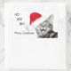 Un chaton tabby en argent dans un chapeau de Père Noël avec sa bouche ouverte donnant un Ho ho joyeux, Joyeux Noël saluant autocollant rectangulaire. Le texte peut être facilement changé ou supprimé, le chaton peut être repositionné.