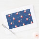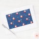 Motif sans couture avec le Père Noël et des flocons de neige sur un arrière - plan bleu, style dessin animé. Les Santas sont bariolés, avec des barbes blanches et des costumes rouges avec des ceintures noires. Les flocons sont de formes et de couleurs différentes, blanc, bleu et orange. Le mot "Joyeux Noël" est parsemé dans tout le motif en petites lettres. La motif est festive et gaie, parfaite pour les fêtes. Art numérique.