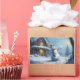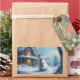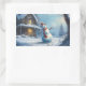 Un tableau d'hiver agréable, coloré, d'un bonhomme de neige devant une maison.