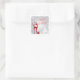 Cet autocollant "Happy Holidays", rouge, gris argenté et blanc carré de 1,5 po, peu coûteux et festif, est orné d'un cerf rouge avec des bois ornés de saints et de baies, d'un cadeau rouge avec des rubans, des flocons de neige, des étoiles et une variété d'arbres de Noël sur un arrière - plan d'hiver gris brumeux avec une bordure enneigée.