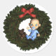 Un petit garçon mignon à jouets est assis dans une couronne de Noël avec son ours en peluche.