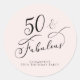 Un autocollant rose pâle pour vos invitations à la fête du cinquantième anniversaire, la correspondance et les faveurs de fête. Ce design élégant et chic présente "50 & Fabulous" écrit dans un script de calligraphie. Personnalisez avec votre nom.