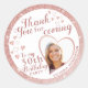 Créez d'élégants autocollants en or rose et en Merci blanc pour la fête du 50e anniversaire, avec un design élégant qui comprend une photo en forme de coeur, le nom de la dame d'anniversaire, et le cinquantième jalon. Le design est décoré avec des coeurs rose vif.