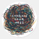Un tourbillon chaotique de gribouillis colorés forme un motif circulaire. Le centre contient les mots "Embrace Your Mess" en bleu clair.