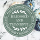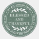 Autocollant d'adresse de retour ronde de remerciement avec votre nom et adresse en typographie blanche élégante, avec le texte BÉNI ET RECONNAISSANT en typographie manuscrite avec une touche élégante de feuillage rustique sur fond vert. Également idéal pour un remerciement professionnel à vos clients ! Ajoutez simplement le nom et l'adresse de votre entreprise ou votre site web. Conçu exclusivement pour vous par Happy Dolphin Studio.