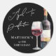 Aged To Perfection 50th Birthday Round Sticker. Celebrate a milestone with this wine-themed round sticker featuring a watercolor black and white wine bottle with a glass of rich red wine on the right. The top left showcases “Aged To Perfection” along with the birthday person’s name and age in a mix of rustic handwritten script and classic serif fonts for a warm yet refined feel. The black background keeps the design striking and clean, making it perfect for milestone celebrations, sealing envelopes, dressing up favors, or adding a stylish detail to your party décor.