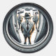 Une vue à travers un trou, montrant trois hommes élégamment habillés en costumes gris et casquette. Au premier plan se trouve un homme sérieux avec les mains derrière le dos, tandis que les deux autres se tiennent derrière lui de part et d'autre. Dans l'arrière - plan, un parking avec plusieurs voitures classiques est visible. La scène dégage une atmosphère mystérieuse et tendue.