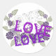 Feuilles et fleurs en gris, vert et violet sont tissés avec le mot "Amour" dans les mêmes couleurs pour créer une belle façon de diffuser le message que l'amour ne peut pas grandir sans notre aide.