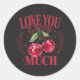 Ce design comporte l'expression "Love You Cherry Many" en typographie audacieuse et ludique. Le texte est accentué par deux cerises rouges vibrantes à la texture disco-boule, créant un effet brillant et réfléchissant. Le design est entouré d'éléments décoratifs, dont des feuilles stylisés et de petites étoiles colorées, ajoutant une touche fantaisiste et romantique. Le thème mêle une ambiance rétro à des visuels modernes et accrocheurs.