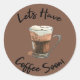 Faites plaisir à vos proches avec le charmant autocollant rond. Appliquez-le sur vos enveloppes d'invitation pour transmettre la demande spéciale d'avoir une date de café bientôt. Ce latte d'aquarelle, rempli de café et de mousse dans une tasse en verre, comporte un message délicieux, "Allons prendre un café bientôt", ajoutant un attrait visuel et donnant le ton parfait pour l'occasion.