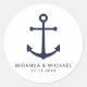 Sticker moderne minimaliste marine Ancre bleue mariage Favor avec ancre bleu marine et nom de mariée et mariée personnalisée avec date mariage en bleu marine moderne sans serif style de police sur arrière - plan blanc. Parfait pour les mariage nautiques, les mariages à thème de plage et plus.