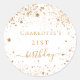 Un autocollant pour une fête d'anniversaire girly et glamour de 21e (ou tout âge). Un élégant arrière - plan blanc avec de la poussière de parties scintillant en faux or foncé. Personnalisez et ajoutez un nom et 21 ans.