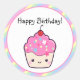 Joyeux cupcake d'anniversaire ! Cet autocollant présente une jolie illustration d'un cupcake joyeux décoré de givrage rose, d'arroses et d'une cerise souriante sur le dessus. Consultez tous les produits correspondants dans le magasin Super Cute Kawaii.