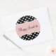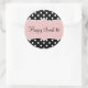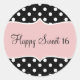 Rose, noir et blanc joyeux anniversaire doux 16 sticker étiquettes dans un design élégant et tendance mignon qui comprend des pois noirs et blancs et un emblème que vous pouvez personnaliser en ligne qui dit Happy Sweet 16