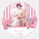 Elégant, glamour et féminin pour une fête de 70e anniversaire. Classic et chic, rayures verticales rose pastel et blanc, fin et fin. Décoré de fleurs roses, de pivoines et de roses. Modèles pour un nom, 70 ans, date de naissance et date de l'anniversaire. Modèle pour votre propre photo de taille verticale. Fille et élégant !