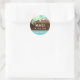 Aqua Floral String éclaire Rustique Merci Mariage Classic Round Sticker. Ce design est composé d'un arrière - plan rustique en bois avec des fleurs vert d'aqua et de menthe agrémentées de lampes à cordes scintillantes. Parfait pour un mariage campagnard d'hiver ou de printemps.