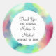 Mariage merci autocollants avec un design abstrait cool et élégant. Les aquarelles se mélangent pour créer l'illusion d'une image spatiale. Vert avec des tourbillons de violet, jaune et rouge clair se mélangent avec un peu de points et d'étoiles blancs. Une élégante création artistique. Un cercle blanc superposé avec votre texte à l'intérieur.