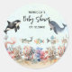 Ce charmant autocollant de baby shower présente une belle aquarelle illustrant le fond de l'océan, présentant des récifs coralliens colorés et de charmants animaux marins tels que les baleines, les dauphins et les poissons, le tout dans des teintes neutres apaisantes. La toile de fond bleu doux, complétée par un effet subtil d'éclaboussure d'eau, apporte une atmosphère sereine à la conception, ce qui en fait l'idéal pour célébrer un bébé garçon ou une fille.