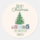Comme vous le voyez, le design présente un arbre de Noël original et coloré, fait à la main et dessiné avec des cadeaux colorés. Et la typographie verte manuscrite de joyeux Noël et le nom de famille manuscrit en rouge.