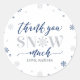 Cet autocollant de remerciement mignon présente de mignons flocons de neige et une typographie élégante "merci beaucoup NEIGE" en bleu bébé et argent. Idéal pour une fête d'hiver à thème de pays des merveilles. Les invitations et les fournitures de fête correspondants sont disponibles dans ma boutique BaraBomDesign.