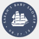 Scellez vos invitations ou faveurs de douche bébé avec ces stickers nautiques mignons en marine et blanc, avec une illustration de bateau avec texte circulaire pour personnaliser avec le nom de l'invité d'honneur et la date du baby shower.