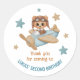 Des autocollants en Merci de cercle mignons pour une fête de Baby Bear Aviator, avec un joli ours volant un avion. Cette conception est personnalisable et personnalisée - vous pouvez modifier le nom, la date, l'adresse et d'autres textes dans cette conception. Aquarelle bleu et bronzée.
