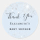 Un autocollant pour un baby shower, célébrant un bébé garçon. Un arrière - plan bleu clair, bleu bébé avec de la poussière de parties scintillant fausse argent. Le texte : Merci est écrit avec un grand script de style à la main moderne. Personnalisez et ajoutez un nom.