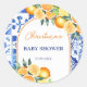 Élégants autocollants de baby shower à thème agrumes aquarelles. L'aménagement comprend des illustrations d'aquarelle d'oranges, de clémentines, de citrons et de feuilles verts, contre un charmant arrière - plan carrelé pour une ambiance méditerranéenne estivale. Utilisez les outils de conception pour customiser le texte, les polices et la couleur.