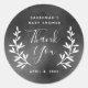 Un autocollant rustique de baby shower merci pour le design de Stacey Meacham avec des branches de laurier dessinées à la main par l'artiste et de la calligraphie merci en blanc sur un arrière - plan noir texturé en tableau noir.