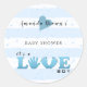 Elégant design de Baby shower avec des rayures bleues et blanches douces motif avec des points de confettis bleu clair brillant et un AMOUR avec des empreintes de main bébé et pieds en bleu, un coeur bleu et une calligraphie de nom. Personnalisez en changeant le nom et le texte.