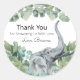 Un joli éléphant gris et vert merci autocollant avec un message et un nom personnalisés. Une façon douce de compléter Merci faveurs pour votre baby shower.